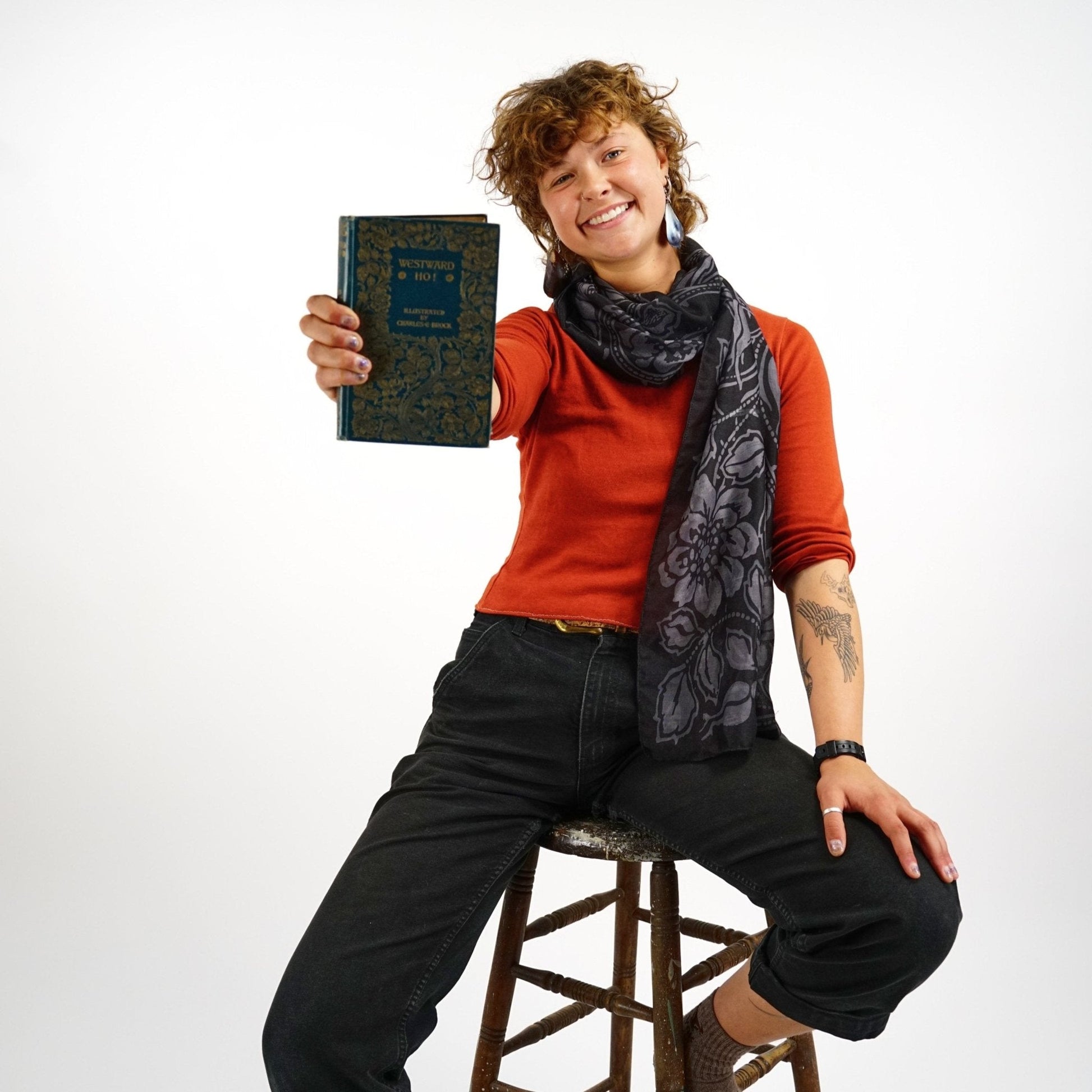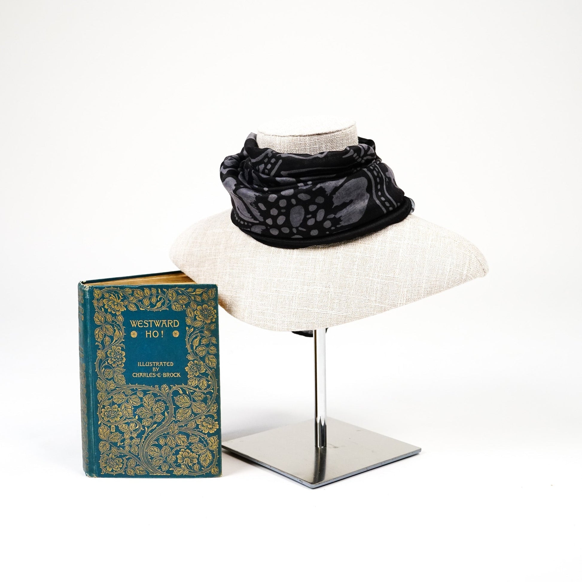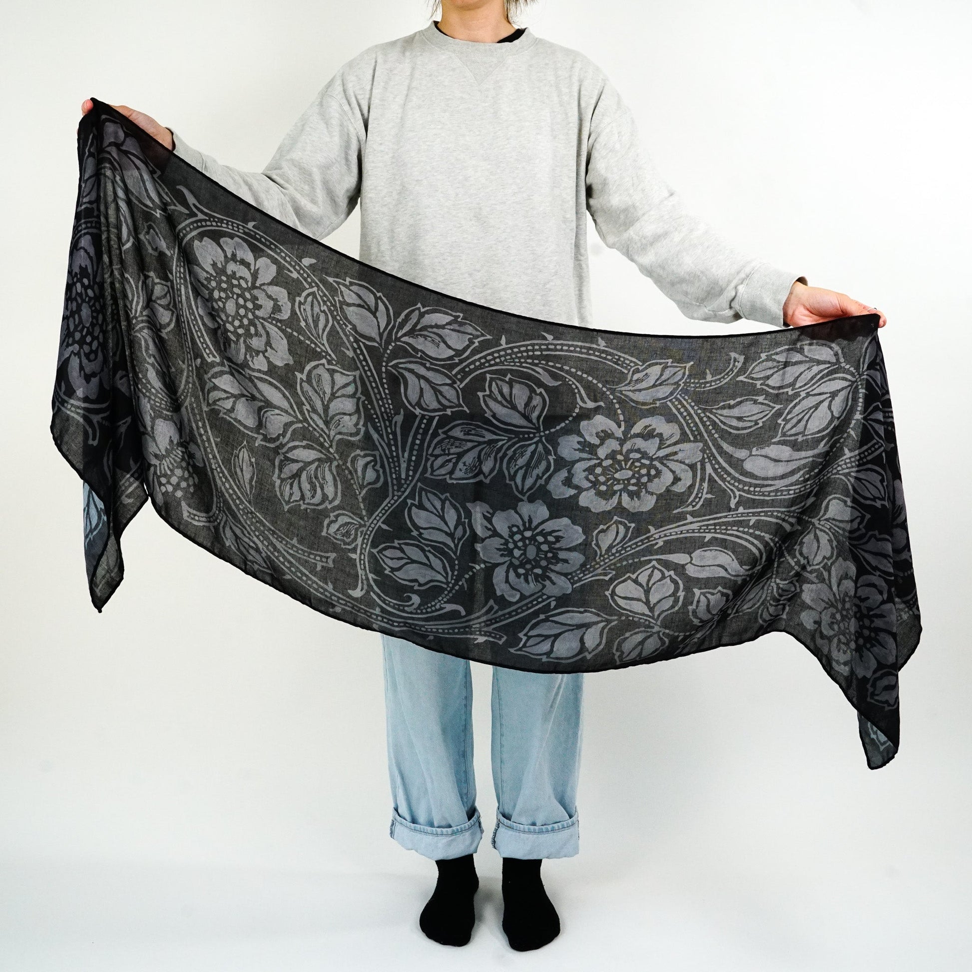 Textured grey briar stems twist and turn beneath etched flowers, set against a stark black background. Explore the expansive styling possibilities this scarf has to offer.