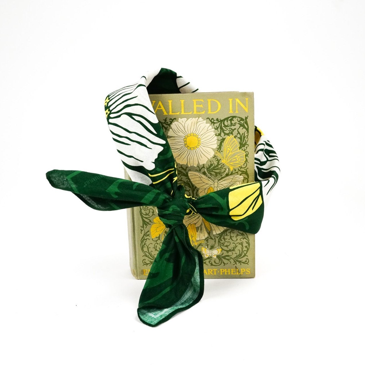 Delicate butterflies pop from the cotton canvas, stark white and yellow against a backdrop of forest green foliage. Add an earthy touch to your outfit sporting this grand bandana.